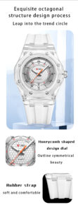 Son bracelet en silicone, souple et léger, assure un confort optimal tout au long de la journée, que ce soit au bureau ou en dehors.